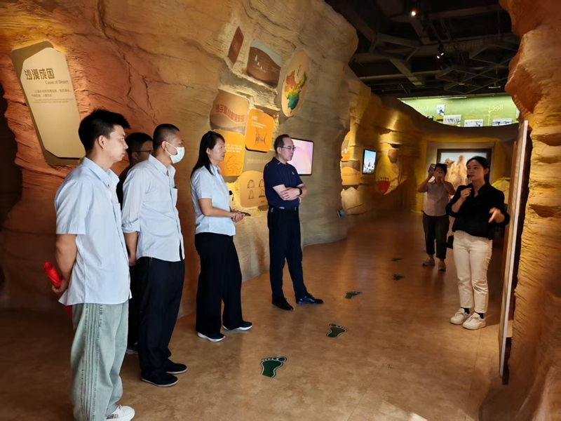 活動(dòng)中,大家參觀(guān)了全國防沙治沙展覽館,學(xué)習了沙漠特點(diǎn)、土地沙化危害,以及我國“三北”工程開(kāi)展情況,并通過(guò)影像、圖片了解了一代又一代白芨灘人探索治沙的過(guò)程與場(chǎng)景。在保護區宸喜園,聆聽(tīng)微課《一顆樹(shù)的情懷》,與2008年時(shí)任中央政治局常委、中央書(shū)記處書(shū)記、國家副主席的習近平考察白芨灘所種棗樹(shù)合影?;顒?dòng)最后,大家通過(guò)俯瞰保護區,進(jìn)入園區改造營(yíng)地,直觀(guān)感受黃沙蛻變綠洲的奇跡。